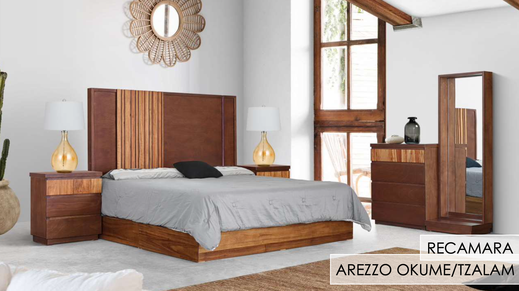 Atrévete a la fusión de texturas y tonalidades con la Recámara Arezo. Su diseño moderno y de líneas limpias permite que el contraste de las maderas sea el verdadero protagonista, creando un ambiente fresco y lleno de personalidad.