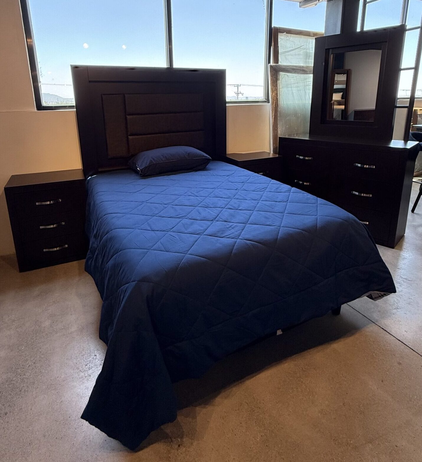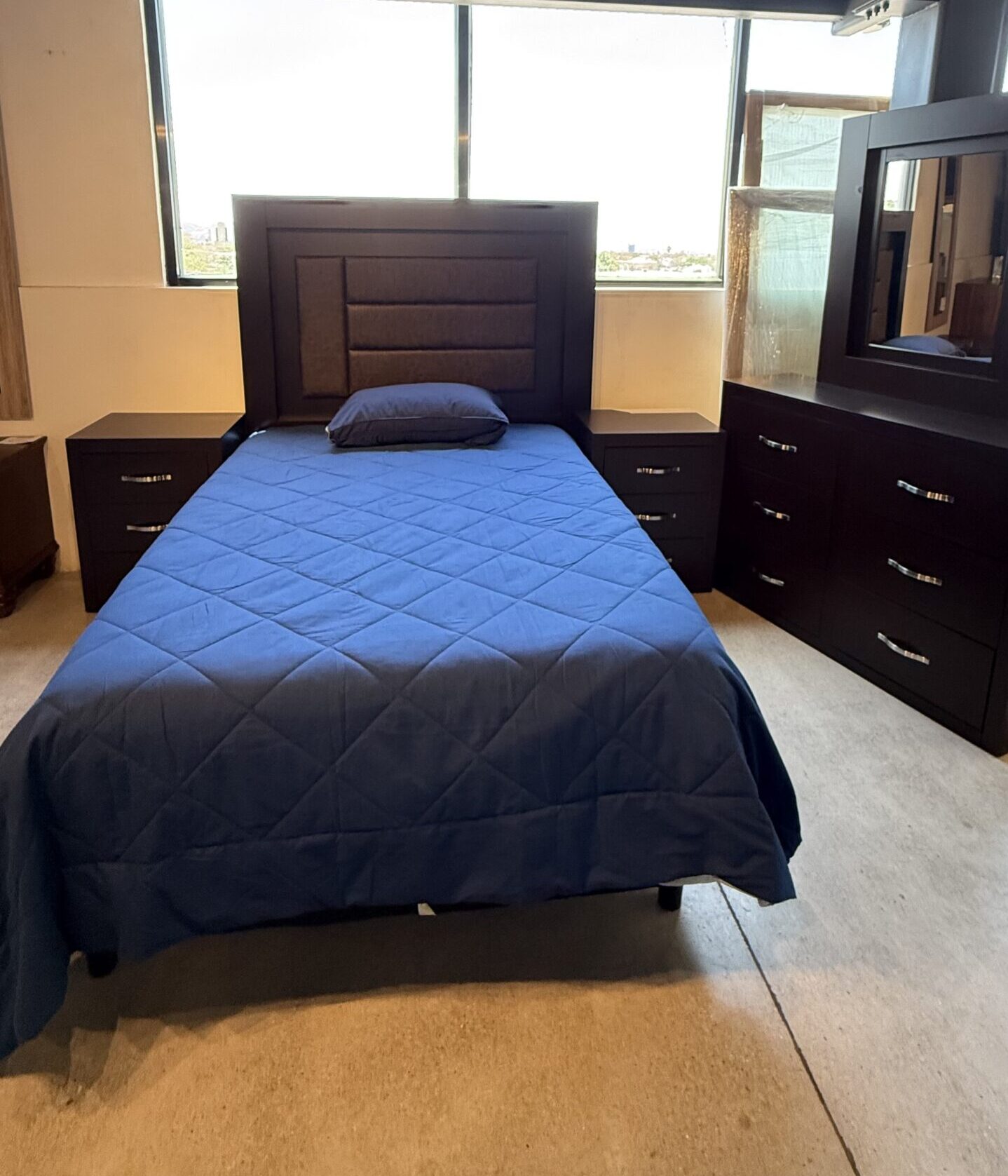 Conjunto: Respaldo Queen Size, dos burós de tres cajones y un tocador de seis cajones con espejo rectangular.