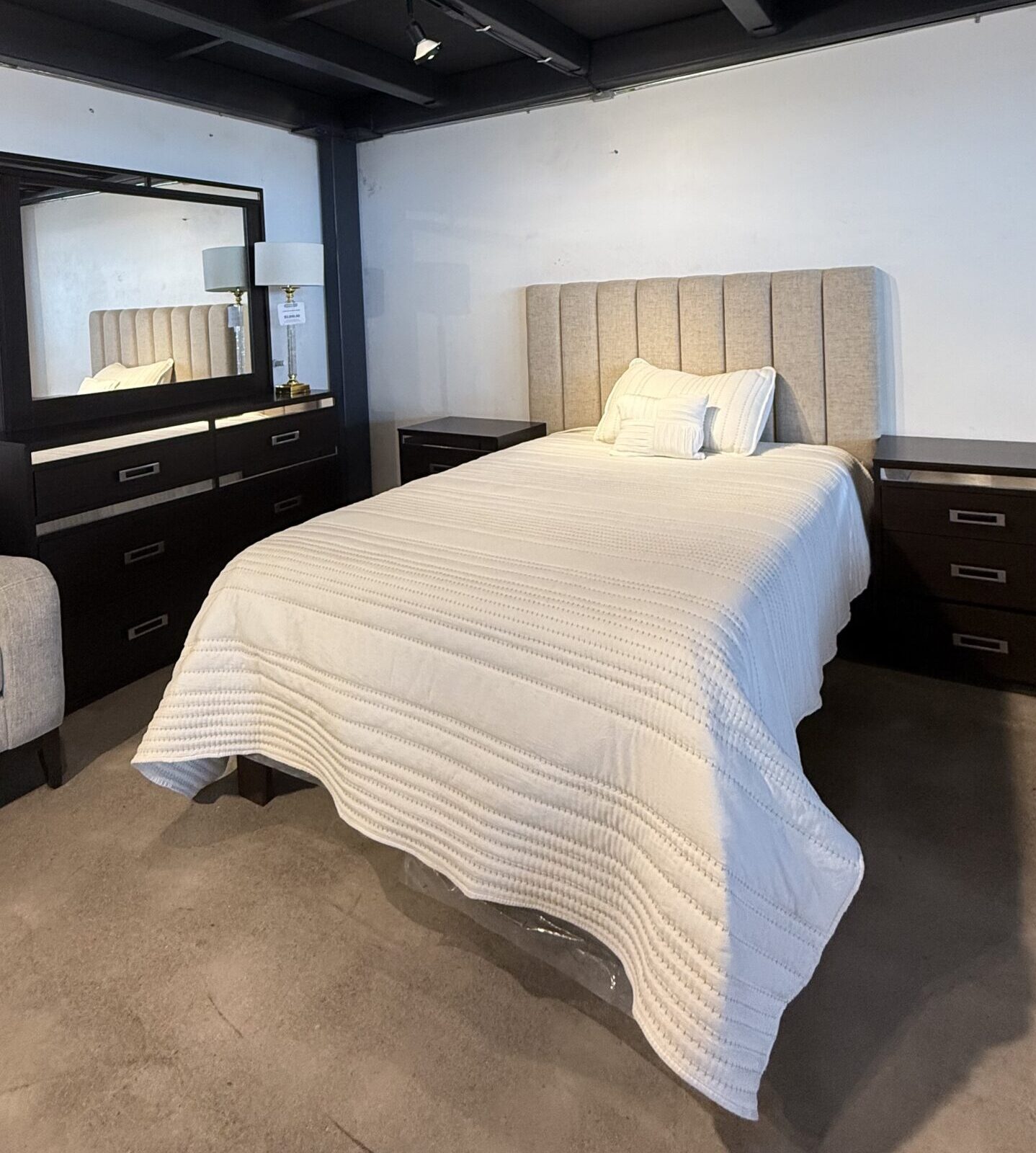 Conjunto: Respaldo King Size, dos burós de tres cajones y un tocador de seis cajones con espejo.